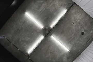Stínidlo v podobě levitující vinylové desky. Přiznané technické rozvody. Odstranění vnitřních parapetů. Způsoby ukončení černého nábytku. Seříznutí směrem k oknům kvůli prosvětlení, uvolnění prostoru a otevření skrytých polic. Těsné přiblížení pod stropem v hale přináší napětí a odlehčení konstrukce.