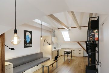 Prvním krokem k získání funkčního a vzdušného bytu bylo odstranění všeho vyjma nosných konstrukcí, zateplení střechy a vytvoření dvou nových oken. Demontáž podhledů odhalila konstrukci krovu, oboustranně prosvětlila prostor a otevřela jej do výšky. Změť příček nahradilo kompaktní hygienické jádro uprostřed dispozice, které elegantně definovalo nové provozní řešení: kontinuální prostor, dvoupokoj pro děti a minimální ložnici pro rodiče.