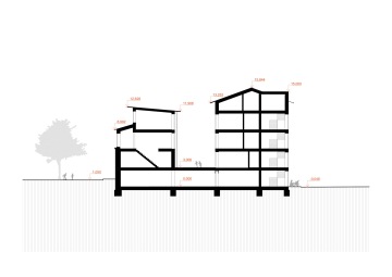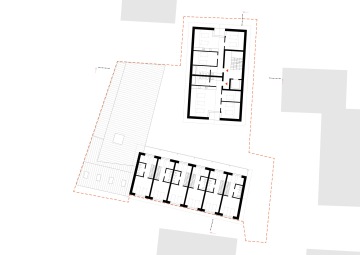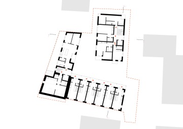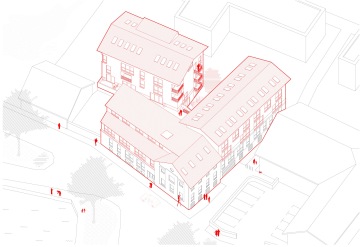 Charakteristickou nárožní hmotu zachováváme v původním tvaru, kompozici i detailech. U navazujících podélných hmot dochází k nástavbám. Jednopodlažní přístavby ve vnitrobloku jsou odstraněny a na jejich místě je navržena novostavba bytového domu. Projekt principiálně vychází z původní zastavěné plochy a v jádru pozemku tak zůstává zachován charakteristický dvůr. Všechny objekty jsou v přízemí propojeny technickým, respektive parkovacím podlažím, na jehož střeše vzniká zvýšená úroveň dvora.