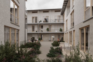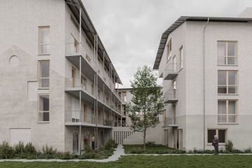 Srdce bytového souboru tvoří dvůr ve dvou úrovních, který slouží pro komunikaci v obou významech a zároveň navazuje na prostory kolem sousedících bytových domů.