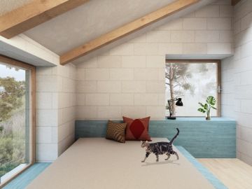 Schodiště integrované do truhlářského prvku pohodlně propojuje obytnou část s částí klidovou v podkroví, kde se nachází hlavní ložnice, pokoj a koupelna.