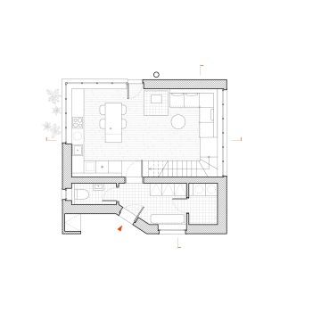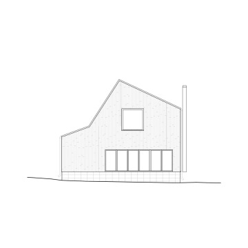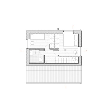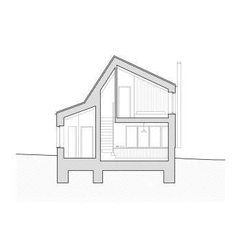 Objekt je mírně zapuštěn do terénu a využívá šikmých střech, aby lépe navázal na okolí, a přitom nabídl dostatek vnitřního prostoru. Vstup do objektu je natočen k příjezdové cestě, což vytváří závětří s úložným prostorem. Nejnižší část stavby směrem k cestě kromě vstupních prostor obsahuje technické zázemí a toaletu. Na zádveří navazuje hlavní obytná místnost v zapuštěné části stavby. Nábytek je umístěn po jejích okrajích s výjimkou multifunkčního ostrůvku v kuchyňské části. Schodiště integrované do truhlářského prvku pohodlně propojuje obytnou část s částí klidovou v podkroví, kde se nachází hlavní ložnice, pokoj a koupelna.