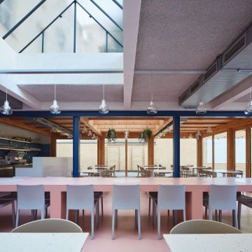 Interiéru dominuje růžová podlaha, z níž vystupují dva zásadní bloky: uvítací pult u vstupu a gargantuovský degustační stůl pro 18 bytostí.