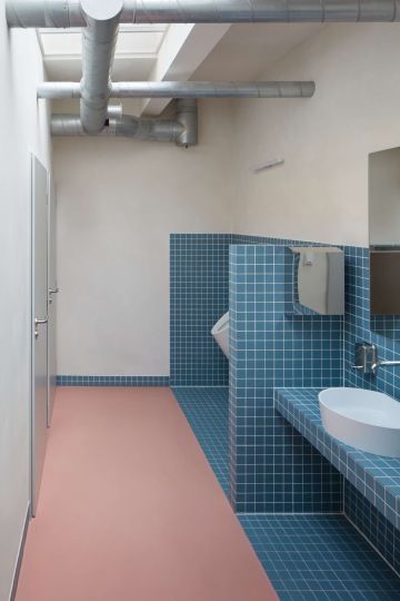 Interiéru proto dominuje růžová podlaha, z níž vystupují dva zásadní bloky: uvítací pult u vstupu a gargantuovský degustační stůl pro 18 bytostí. Podlahu lemuje jedna řada modrého keramického obkladu, který se v patřičných místech (šatna, bar) zvedá do potřebné výšky. Materiály a barevnost zbylých prvků jsou spíše decentní, aby podtrhly výraznou barevnost a čistotu celého interiéru. Za zmínku stojí hrubá akustická omítka uzavírající prostor na stropě a umělý kámen, z něhož jsou vyrobeny desky stolů a kuchyňské i barové pulty.