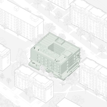 Srozumitelná budova potvrzuje pevný střed urbánní struktury, kterou zároveň zprostupňuje a oživuje. Otevření severozápadní části pozemku rozšiřuje veřejně přístupný prostor a vytváří přátelský předprostor aktivnímu parteru s kavárnou, službami a hlavním vstupem do Domu sociálních služeb. Uchopitelné měřítko a obytný charakter vyšších podlaží napomáhají vytvořit pocit domova. Výrazná betonová římsa vertikálně člení pětipodlažní objekt, jehož sokl se liší materiálem i charakterem otvorů a dům pevně usazuje do terénu. Solidní materialitu a uklidňující