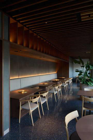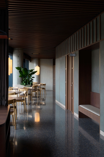 Atypicky lineární prostor pro korejskou restauraci se nachází v nové budově rovnoběžné s kolejištěm Masarykova nádraží. Rozhodli jsme se podpořit jeho nejsilnější danost a podél průběžné prosklené fasády zachovat volně plynoucí prostor pro hosty, který usazuje těžiště v podobě ústředního pultu pro mistra suši.