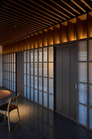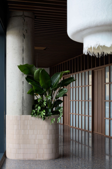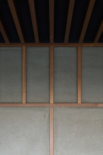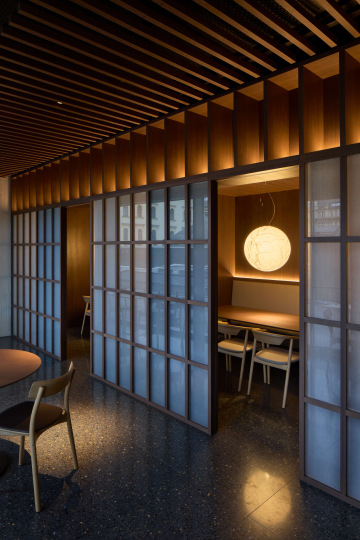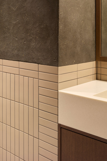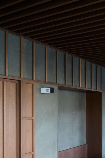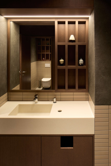 Hliněná omítka je zde použita jako elementární materiál a spolu s kamennou podlahou, keramickým obkladem, dřevem a detaily z rýžového papíru vytváří zemitý a taktilní charakter interiéru.