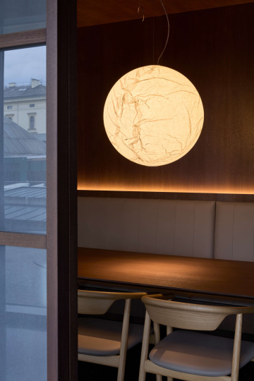 Svítidla evokující měsíc a noční oblohu doplňuje otevřený oheň hot potů, čímž vzniká harmonický celek propojující inspiraci asijskou tradicí se současným gastronomickým prostředím.