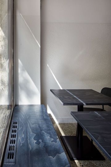 Obligátní překližka získává elegantní černý nátěr, který kontrastuje s nerezem, bílobílým obkladem a také bílou, originální Kro linkrustou prověřenou z kavárny. Na podlaze došlo k odstranění rádoby dřevěného vinylu a očištění původního, ušlechtilého terazza, které bylo v místech nových rozvodů přiznaně záplatováno broušeným betonem s výrazným kamenivem.