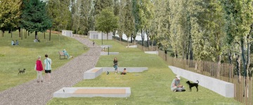 Zadruhé jde o kompoziční princip páteře a volna. Nově navržená hlavní cesta vymezuje svobodně plynoucí prostor louky s rozptýlenými elementy, který je lemován adekvátně koncentrovaným pásem pro funkční využívání areálu.