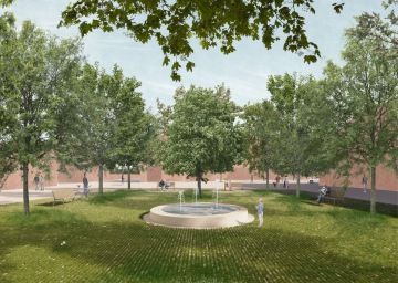 Na sjednoceném povrchu je zásadním kompozičním prvkem práce se stromy a měkkostí povrchů, jimiž vymezujeme plochy a místa.