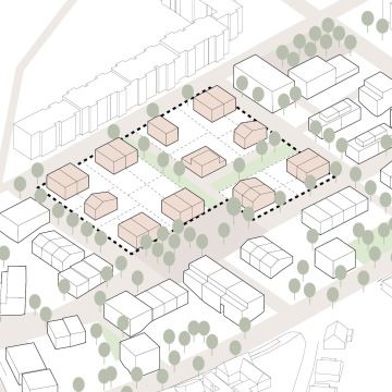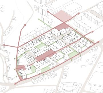 Pro návrh jsou klíčové tři místní fenomény: velkorysá ortogonální kompozice hlineckého sídliště, měkká terénní hrana včetně drobné organické zástavby oblasti Peklo a intenzivní linie silnice II/147. Dopravní tepna je moderována pravidelným rytmem štítů, přičemž kvádry domů formulují hlavní vstupy do území. Ve vazbě na Hlinky je navržen racionální, více intenzivní městský charakter, který analogicky pracuje s kompozičními prvky sídliště. Návrh zároveň posiluje a doplňuje podélné osy celého širšího území. V jižní části se struktura naopak stává nepravidelnou, zrnitější a rozmanitější. Oba systémy jsou propojeny zlomem v geometrii, který ukončuje jednu z hlavních os celé lokality a umožňuje průhled na kostelní věž z náměstíčka. Toto porušení pravidla v sobě také nese odkaz na původní zástavbu ubytovny.