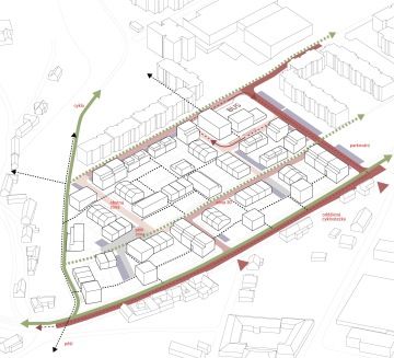Navržené úpravy veřejných prostranství respektují kompozici celého souboru z 80. let a posilují, respektive vytvářejí tři hlavní podélné osy celé lokality.
