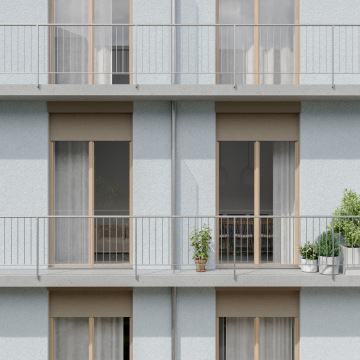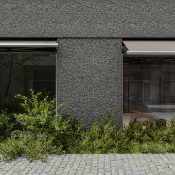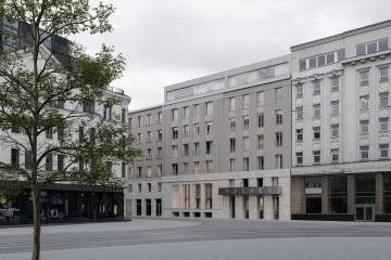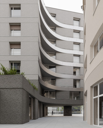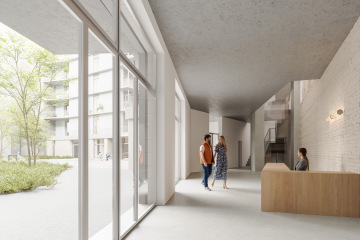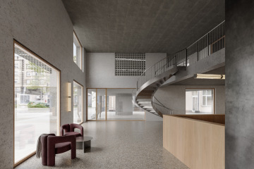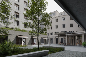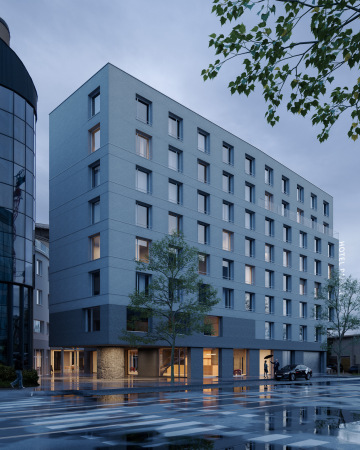 Geometrie přístavby nájemního bydlení reaguje na stavební čáru protější hmoty bloku, aby společně tvořily rozmanitý a příjemný prostor vnitrobloku. Analogicky se pak hmota novostavby hotelu směrem do vnitrobloku kontextuálně přizpůsobuje obloukovým tvarům stávající zástavby, zatímco směrem do ulice vytváří čitelnou hranu a protiváhu kompaktnímu bloku administrativní budovy.