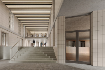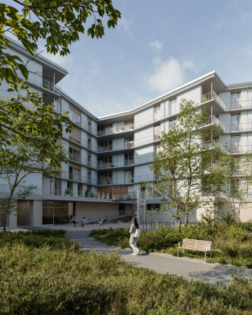Obě hlavní funkce projektu – hotel a bydlení – doplňují veřejné a komerční funkce v přízemí. Hotel navrhujeme do novostavby podél frekventované ulice Na Karolině ve vazbě na dopravní uzel a aktivní parter piazzetty. Bydlení je naopak umístěno do rekonstruovaného objektu, kde přirozeně využívá prolamované jižní fasády otevřené do klidného vnitrobloku. Zde také přirozeně navazuje na studentské bydlení, s nímž může synegicky sdílet dvůr a vhodné funkce jako coworking, prádelnu, komunitní místnosti, saunu apod.
