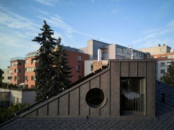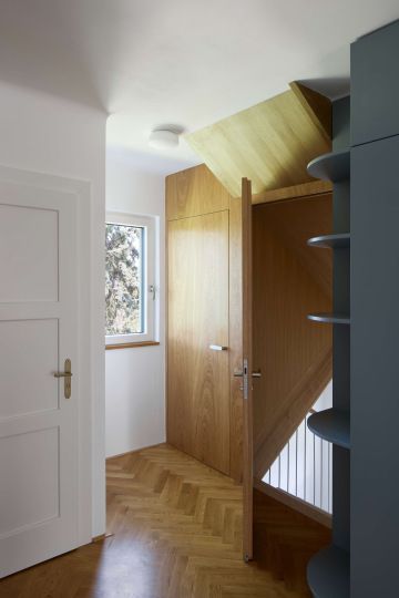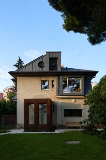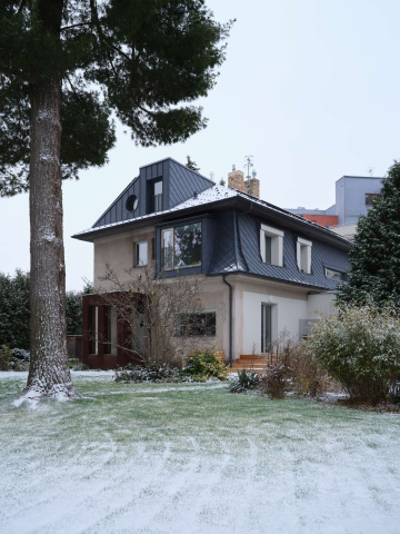 Hlavní zásahy se týkaly zobytnění půdy, kde jsme navrhli nový vikýř a střechu jako celek. V druhém podlaží došlo k decentní úpravě dispozice a novému řešení interiéru jako celku. Důležitou součástí byla komplexní úprava schodiště, od funkčního řešení po jeho formu a detaily. V rámci rekonstrukce došlo také ke kultivaci terasy a výměně oken.