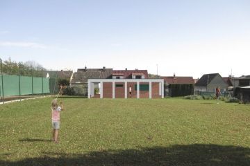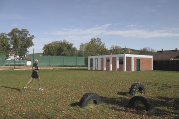 Cihelné pilíře a platforma definují krytý předprostor, který chrání před deštěm i sluncem, ať už odpočíváte po hře, sledujete své děti při pobíhání na louce anebo vás přepadla bouřka během cvičení ve venkovní posilovně. Vlastní objekt je rozdělen na čtyři stejně velké části s požadovanými funkcemi, které jsou orientovány logicky vůči svému okolí a kontextu. Šatna a hygienické prostory se otáčí k hřišti na sever, hlavní „pobytový“ prostor na západní straně objektu má výhled na stromy a celý prostor louky, posilovny a hřiště.