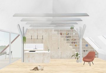 Neobvyklou výzvou se stala neexistence (a nemožnost vzniku) vnitřního schodiště do podkroví.